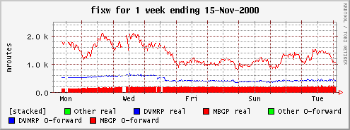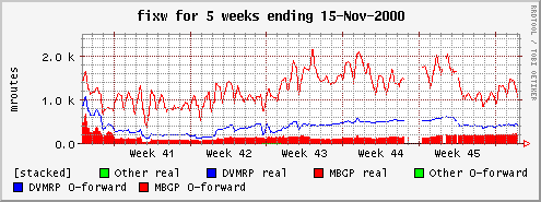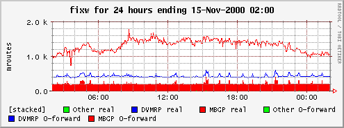 The areas represent forwarding cache entries that have been used to forward packets. The lines represent those that have not been used to forward any packets. The lines and areas are "stacked", meaning that e.g. the actual number of MBGP entries that have not been used to forward any packets is the red line minus the blue line.